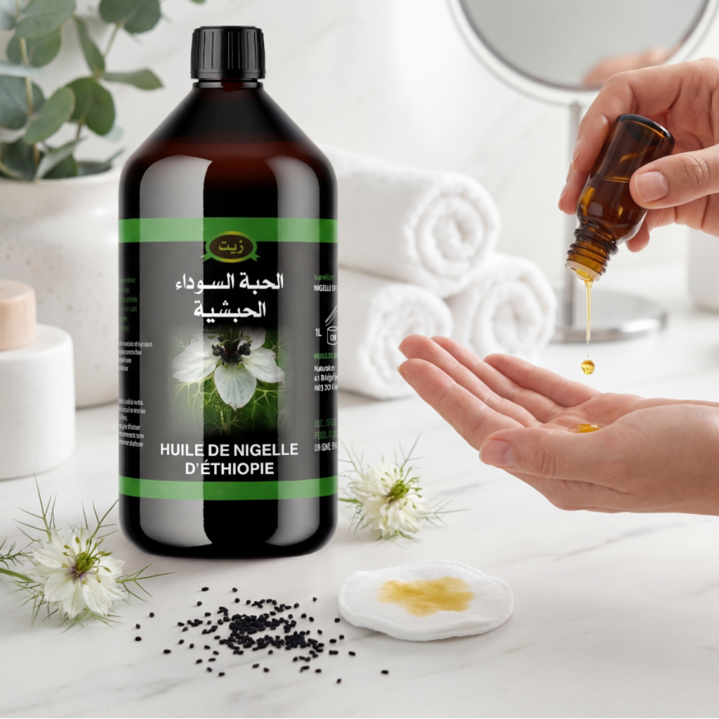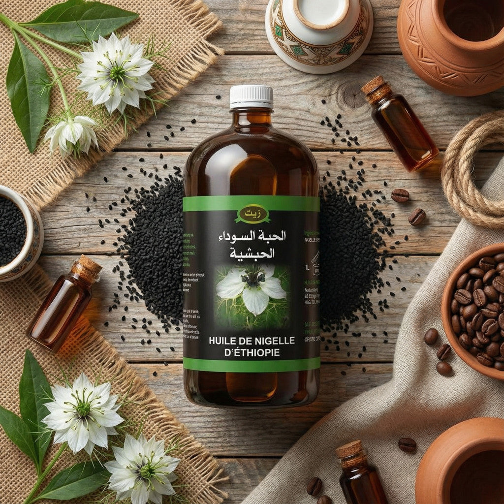 Découvrez l’huile de nigelle d’Éthiopie en grand format 1 litre, aussi appelée cumin noir (black seed). Proposée en bouteille, elle convient à un usage alimentaire (cuisine/assaisonnement) ainsi qu’à un usage cosmétique (soin externe peau & cheveux), selon vos habitudes.