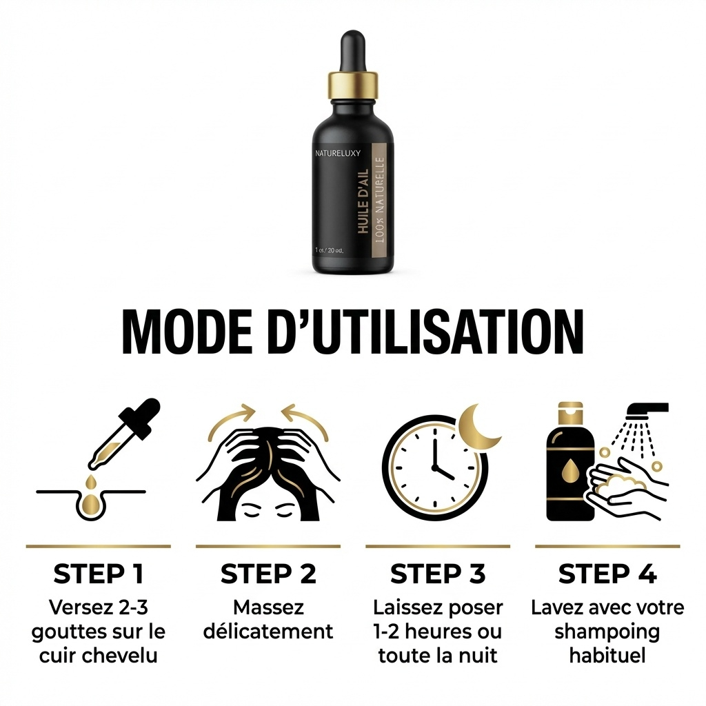 Vous pouvez utiliser l’huile d’ail une fois par semaine en bain d’huile pour une cure d’entretien, ou avant chaque shampoing pour une cure intensive, sans toutefois dépasser 4 à 5 semaines d’utilisation continue.