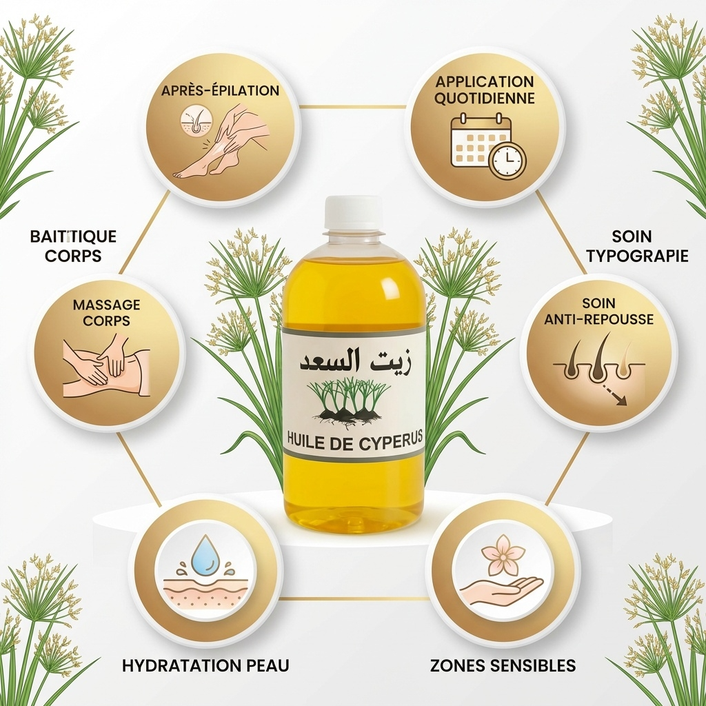 Huile de souchet ralenti vraiment la pousse des poils, je verrai si au bout de plusieurs mois cela diminue le nombre de poils.le seul problème c'est que c’est de l’Huile...donc c'est gras...