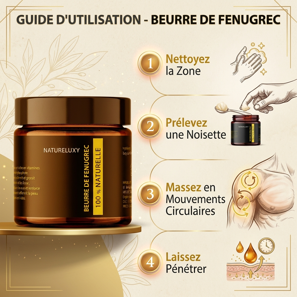 Le fenugrec est traditionnellement apprécié dans les routines de beauté pour le massage du corps et l’entretien des cheveux. Ce beurre peut s’intégrer à une routine simple pour prendre soin des zones sèches, des longueurs ou du cuir chevelu, selon vos habitudes d’utilisation.