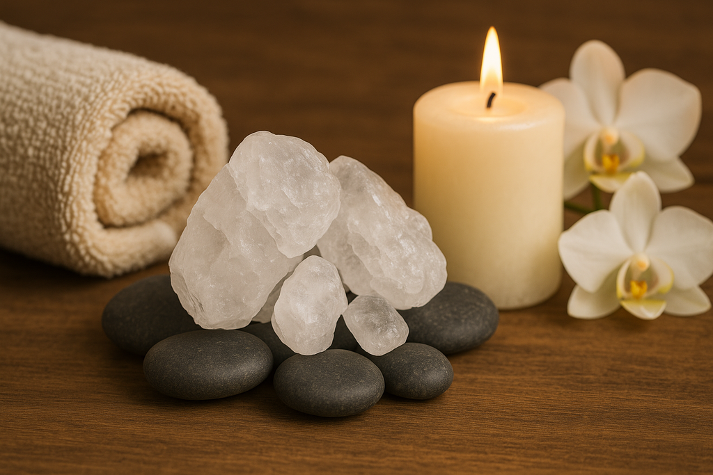 Natürlicher Alaunstein oder „Kaliumalaun“ besteht ausschließlich aus Kaliumsalz, einem inerten Element, das aus der Natur stammt.