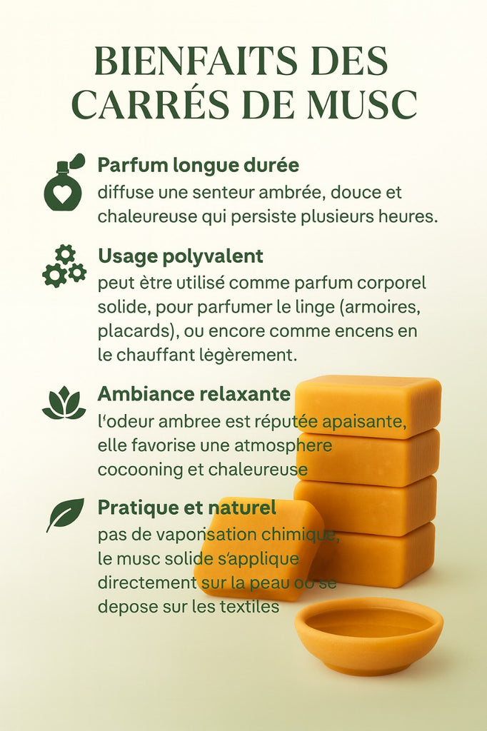 Le musc offre un délicat parfum naturel et sauvage. Ce carré solide est utilisé pour se parfumer soi-même en le frottant sur la peau ou pour parfumer votre linge en le disposant dans vos armoires.