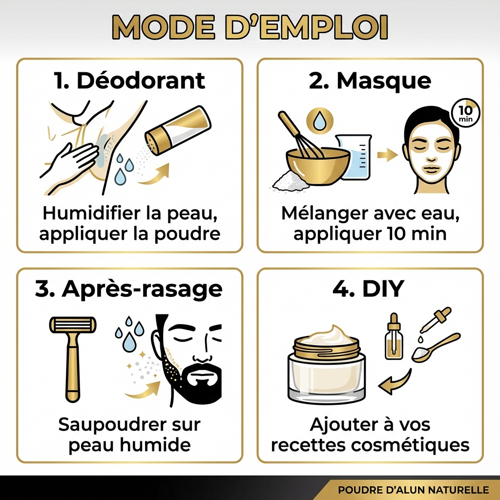 Il suffit d'appliquer la pierre d’Alun naturelle sur la peau mouillée (aisselles, pieds, visage...) puisque la pierre est soluble dans l'eau. Elle est très bien tolérée par les peaux les plus sensibles.