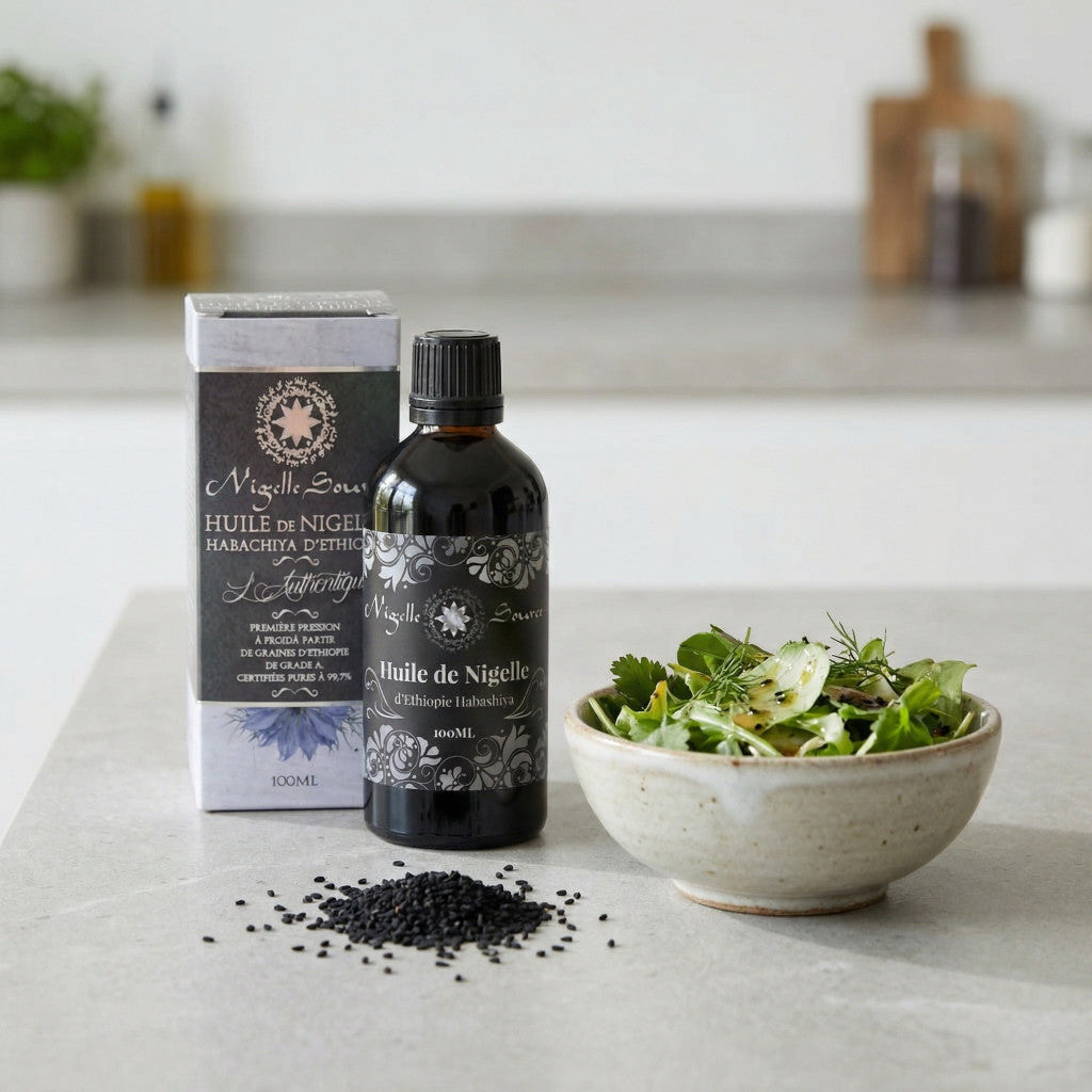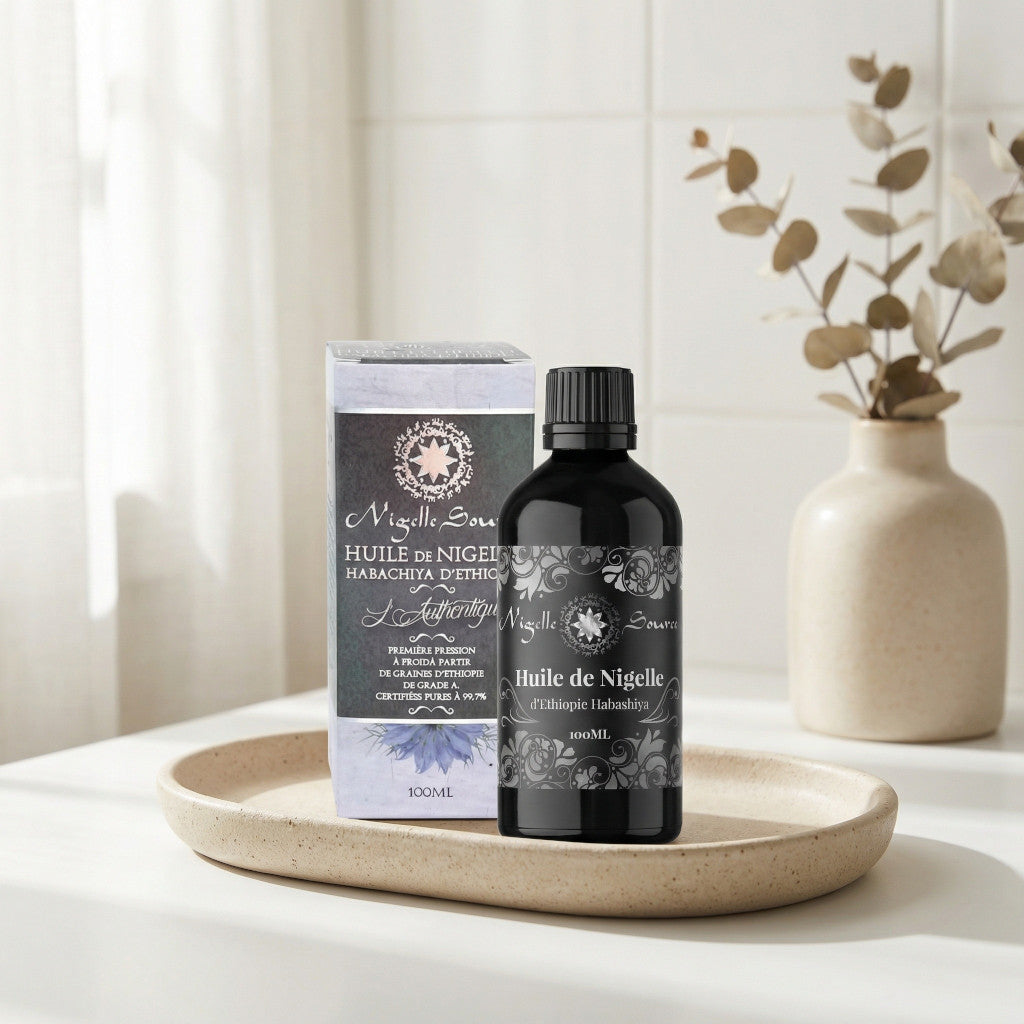 Commencez par de petites quantités, surtout si vous découvrez la nigelle. Le ressenti (odeur, goût, confort cutané) peut varier d’une personne à l’autre.