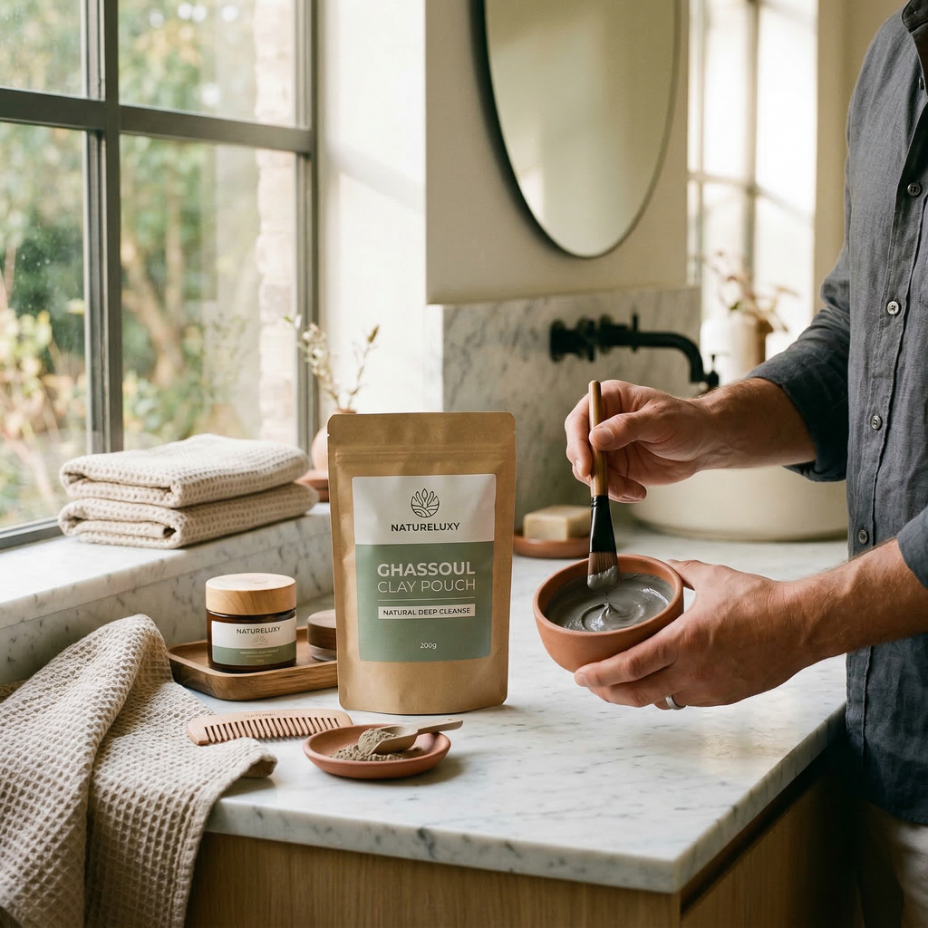 Le ghassoul est utilisé depuis longtemps dans les rituels de beauté, notamment pour le nettoyage du visage, les soins du corps et l’entretien des cheveux. Mélangé à de l’eau, il forme une pâte douce facile à appliquer, appréciée pour une routine de soin simple et naturelle.