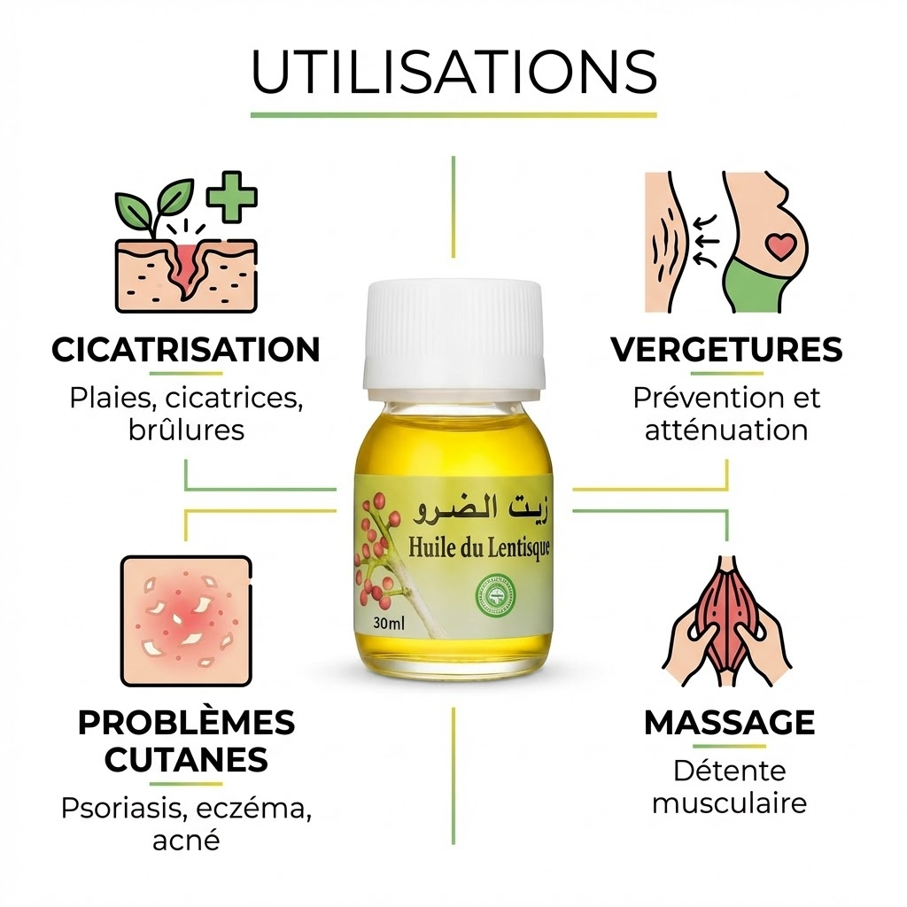 L’huile végétale de lentisque est riche en acides gras elle est connue pour ses propriétés antioxydantes et anti-inflammatoires. Elle permet ainsi d’apaiser la peau et les petits bobos du quotidiens.
