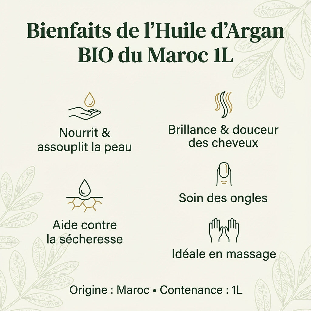 Offrez à votre peau et vos cheveux un vrai rituel de soin avec notre huile d’argan BIO en format 1L. Inspirée des usages traditionnels au Maroc, elle s’intègre facilement à une routine beauté et bien-être : nourrir, assouplir, apporter un éclat naturel et accompagner vos moments de massage. (Les résultats peuvent varier selon les personnes et la régularité d’usage.)